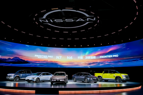 車型亮相,從左至右:Frontier Pro PHEV、N7、N6、天籟·鴻蒙座艙、Frontier Pro